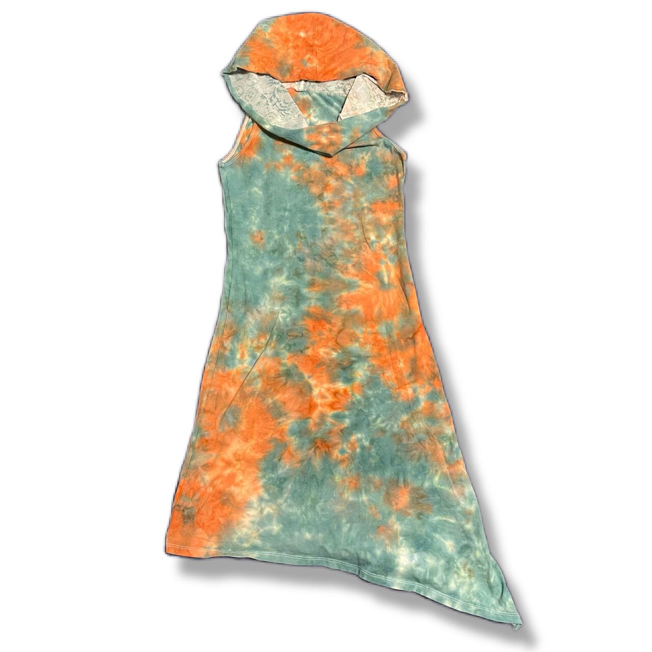 大きめのフードが着いたワンピースです。こちらのワンピースはTrishuLさんのオリジナル商品です。アシンメトリーの丈に大きなフードがとってもかわいいです。フードの中はバーンアウト生地という透け感のある生地を使っています。
