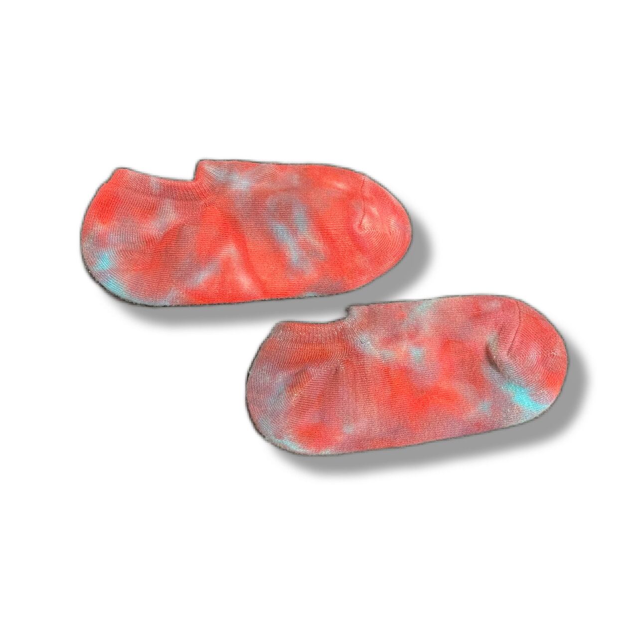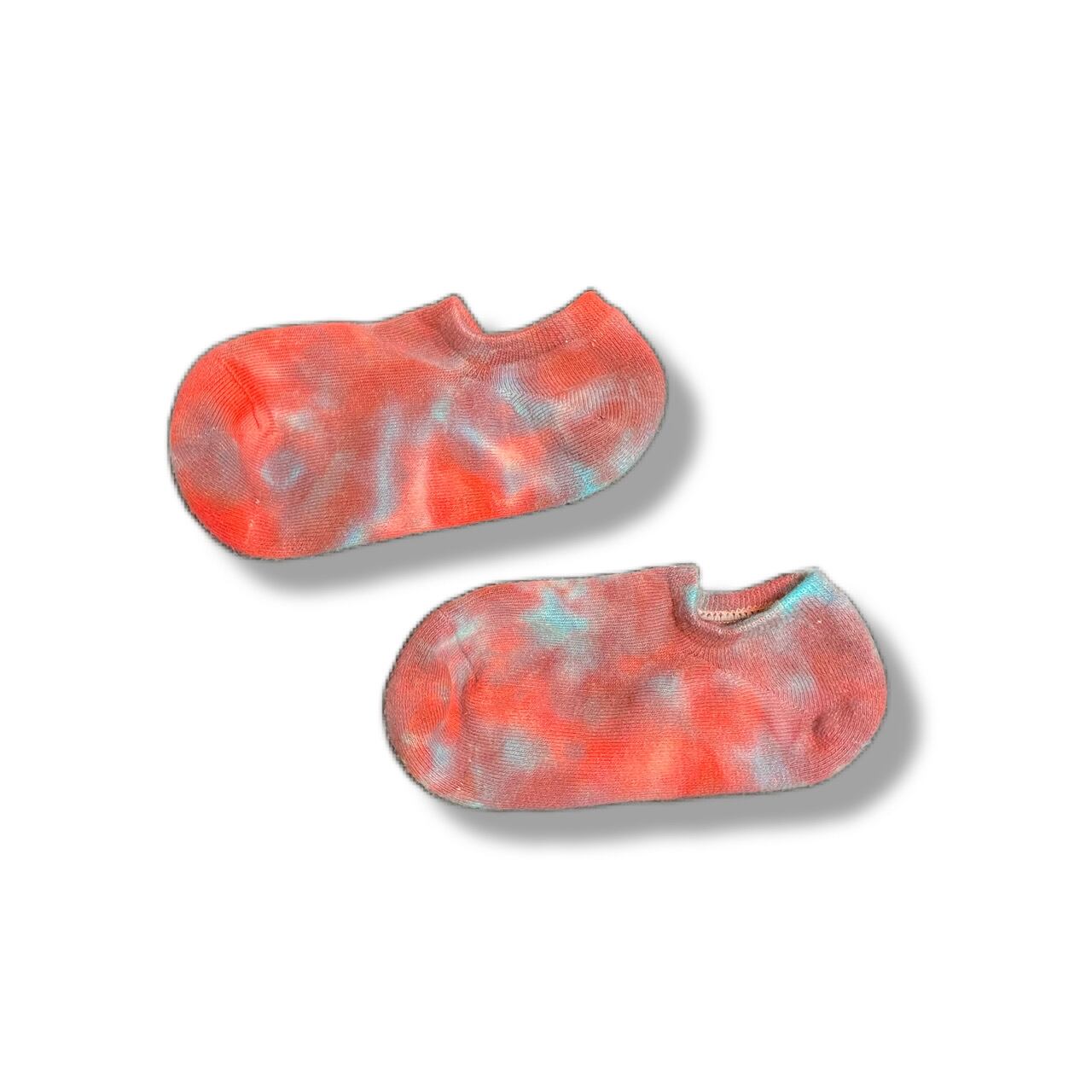 かなり短めのくるぶしレディースソックスです。くるぶしが出るくらいの丈です。水色と赤が混ざってパープルっぽい色もでてる複雑な色合いがかわいいです。