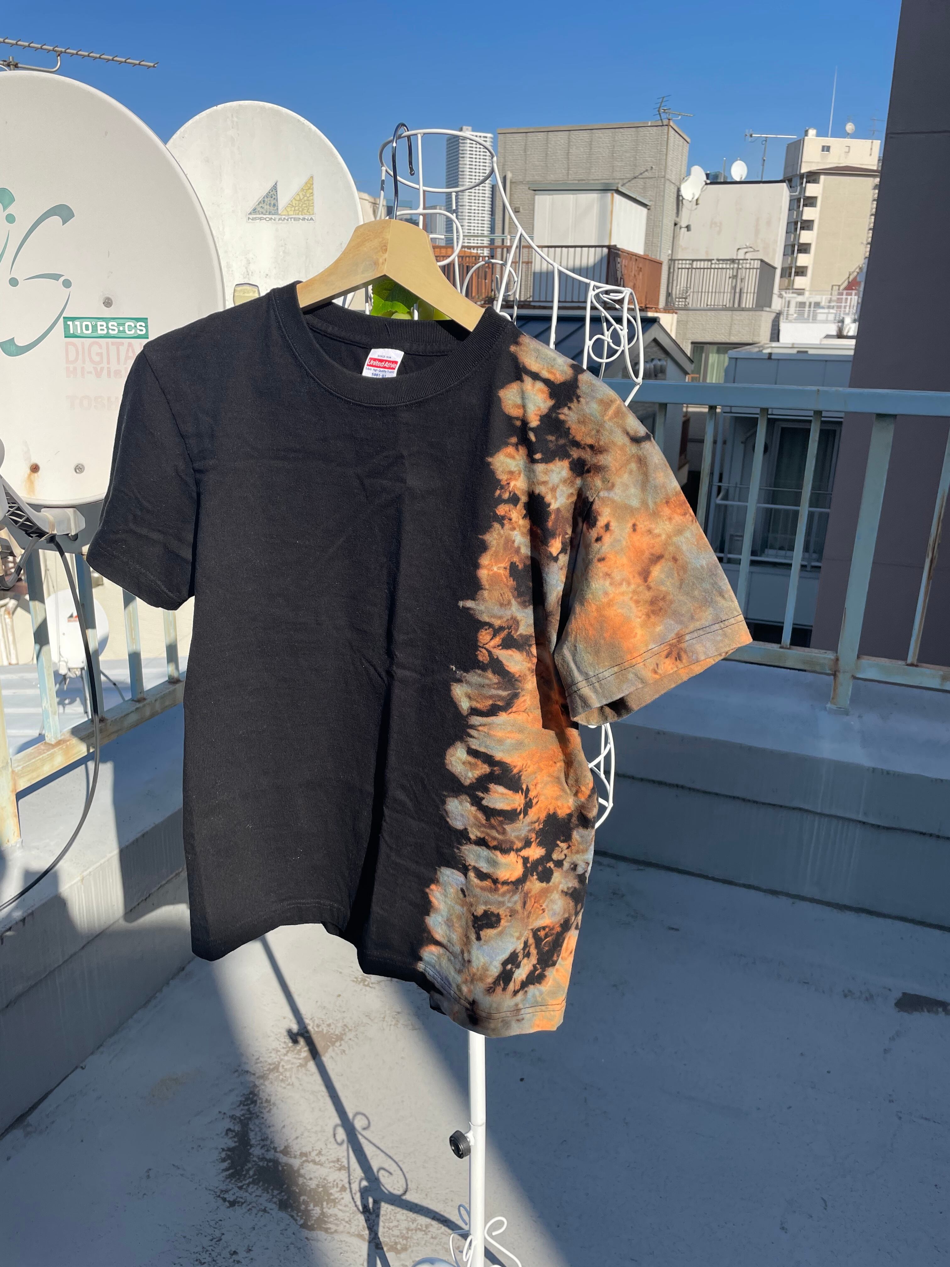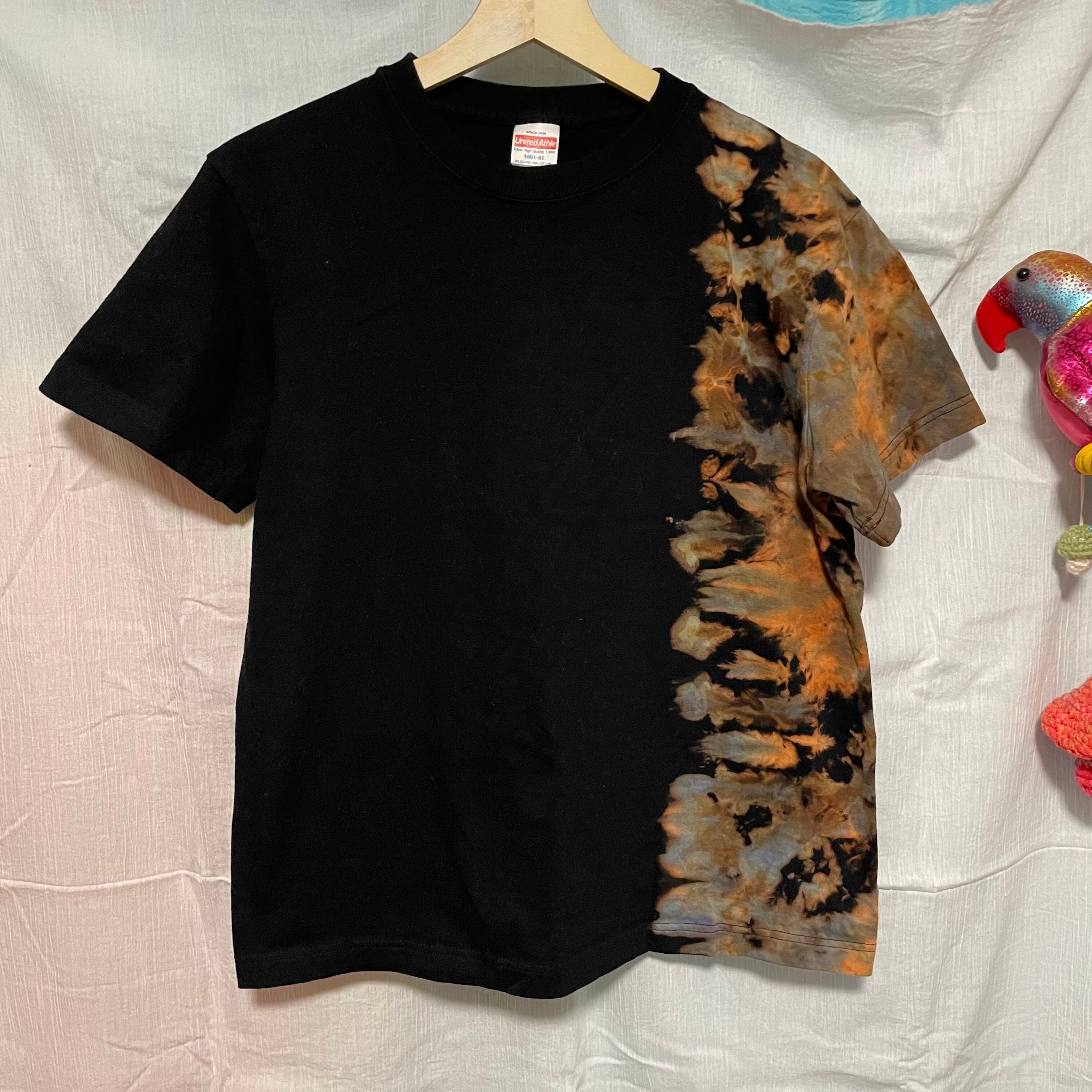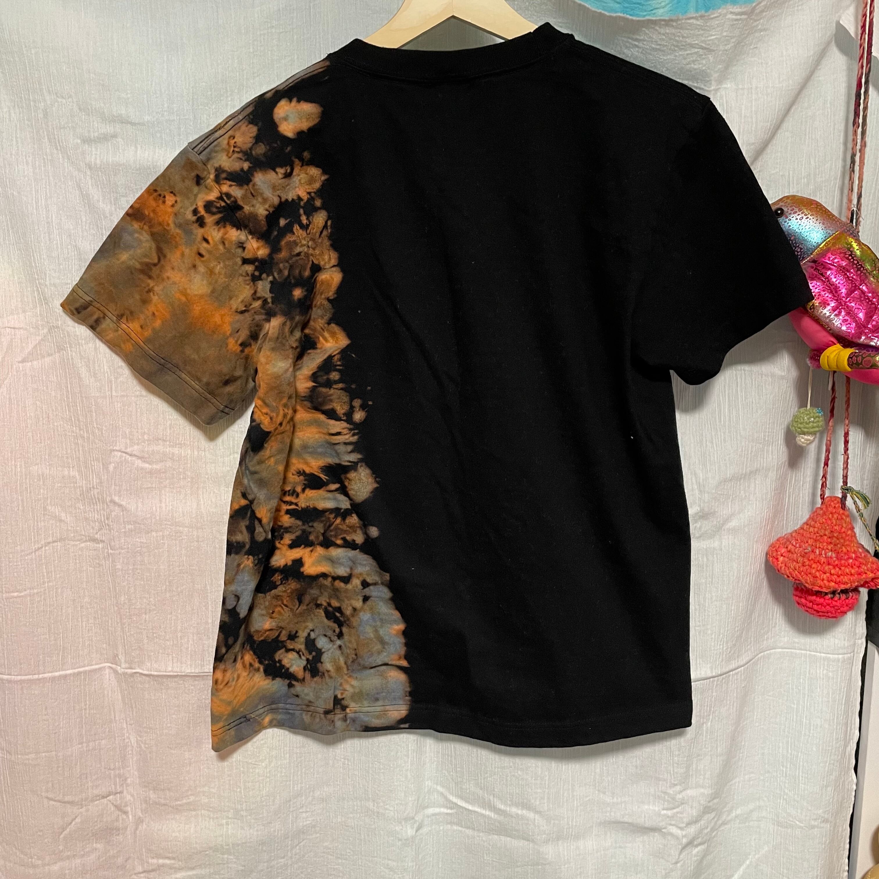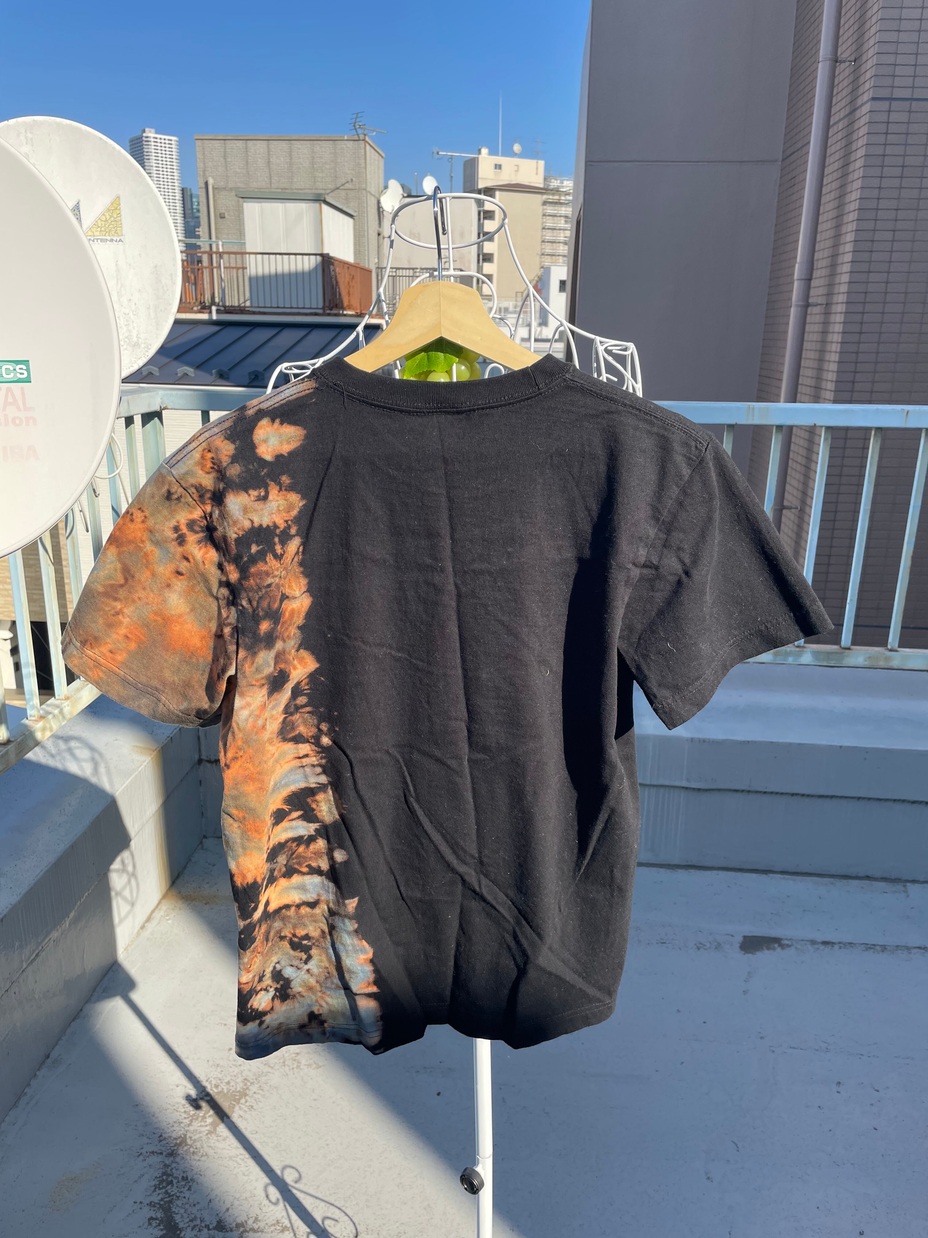 右側だけブリーチしてから染めたブリーチタイダイTシャツです。しぶくてカッコいいので、普通のタイダイは派手すぎる…というあなたにぜひ着てほしい1着です!