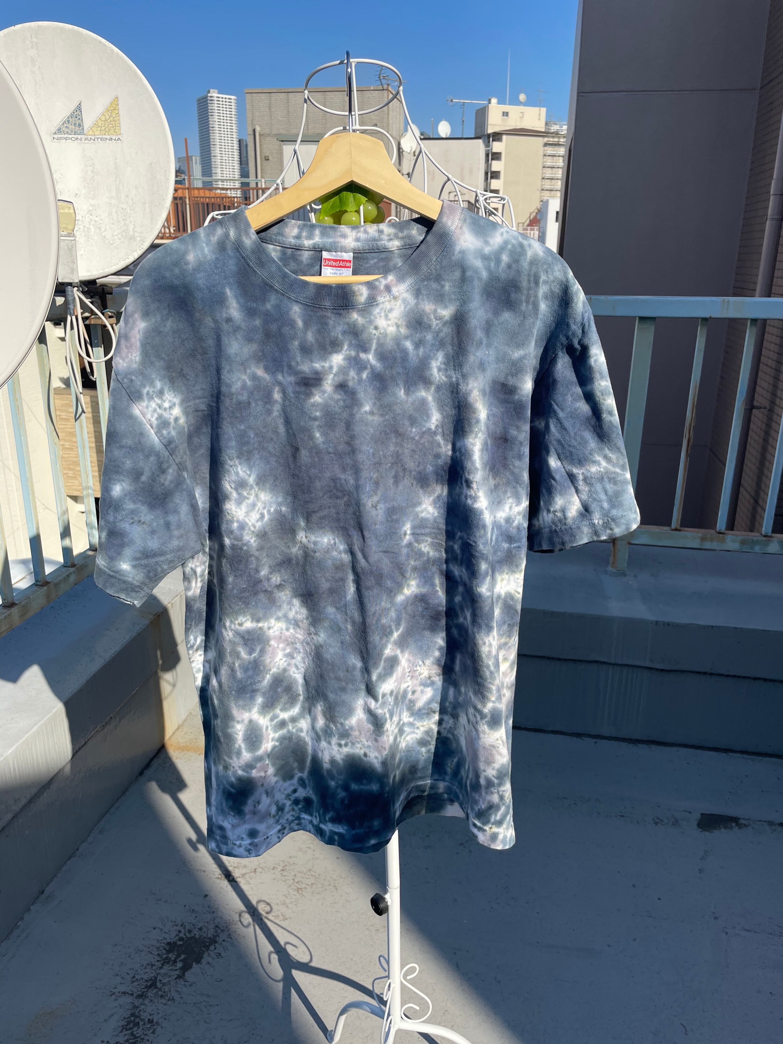 黒とグレーのTシャツです。タイダイで染めた黒は真っ黒じゃなくてちょっと墨っぽい黒になる。その感じはプリントでは出せない手染めならではだなぁと思うのです。