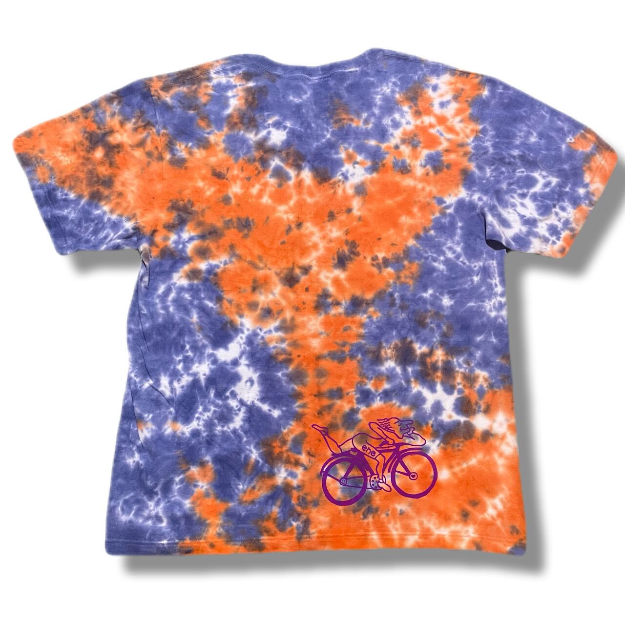 海から見る朝日みたいなイメージで、綺麗な青とオレンジで染めました。シルクスクリーンロゴ入りです。