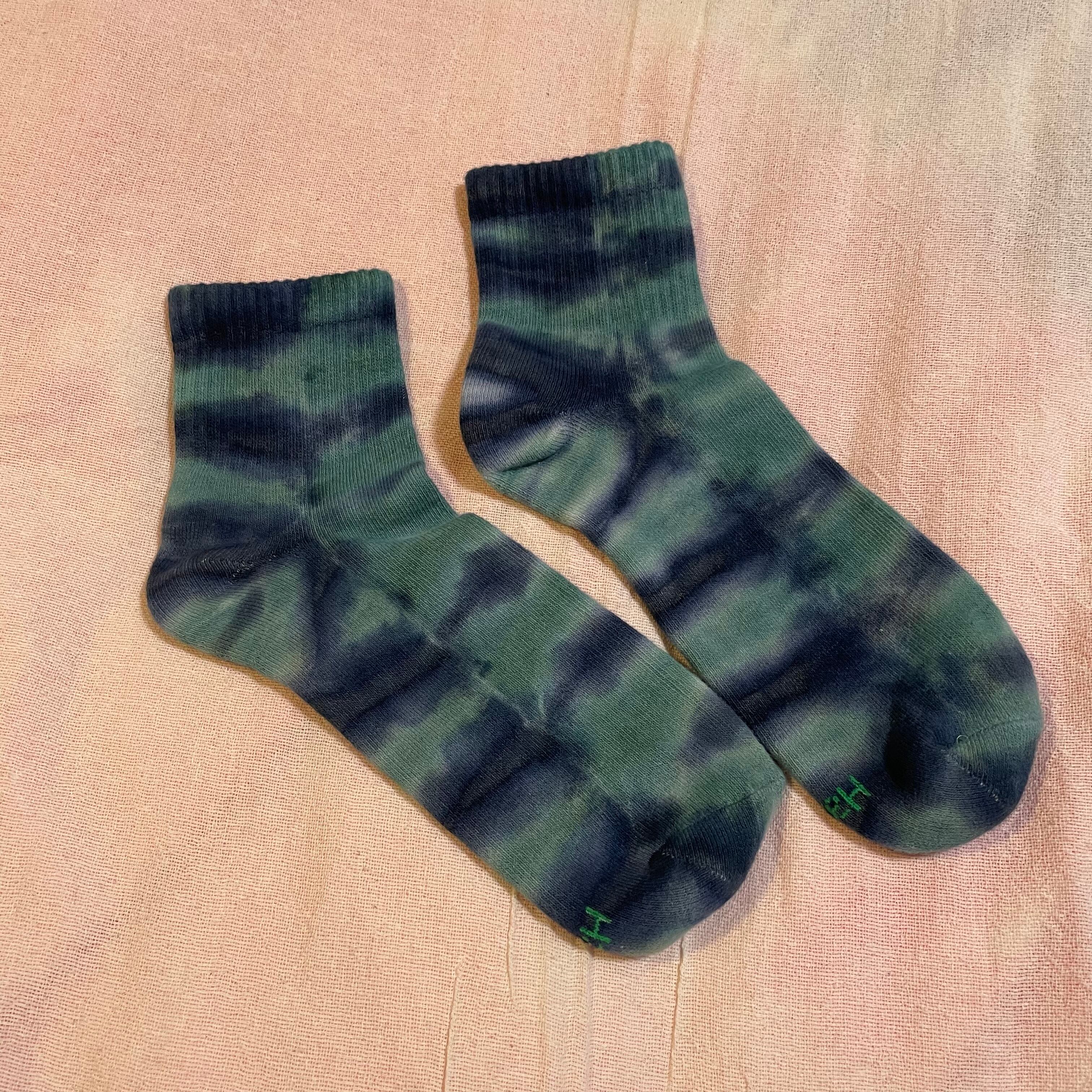 Hanesのメンズ靴下を染めました。ちょっと長さがあります。カーキとブラックでボーダーっぽく染めました。