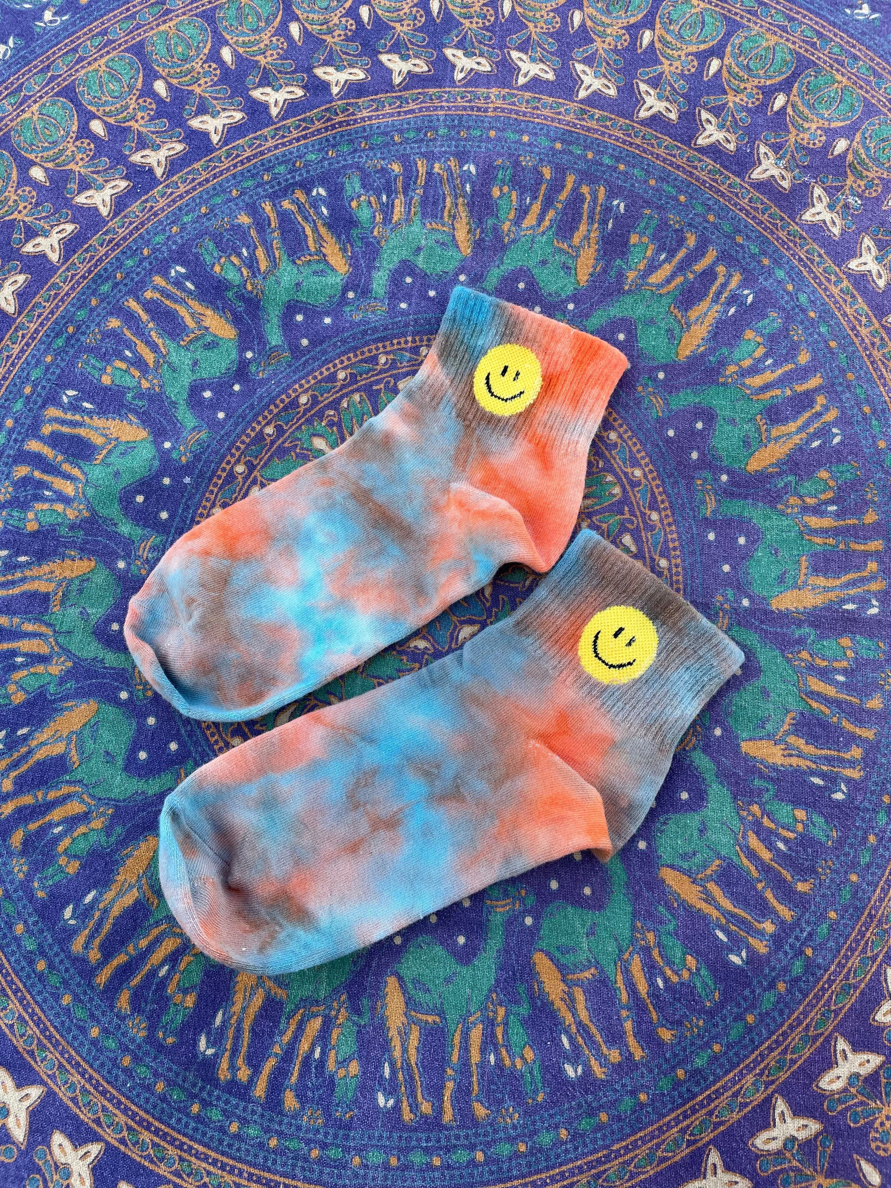 夕暮れカラーのニコちゃんがかわいい靴下です。